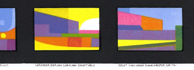 A multiblock, reduction linocut that started as an idea to show different compositional designs of my own making. I ran out of ideas after 20 so added some famous artworks. Then decided I should do them all as paintings I like, reduced and simplified. The artists names are listed below each column.