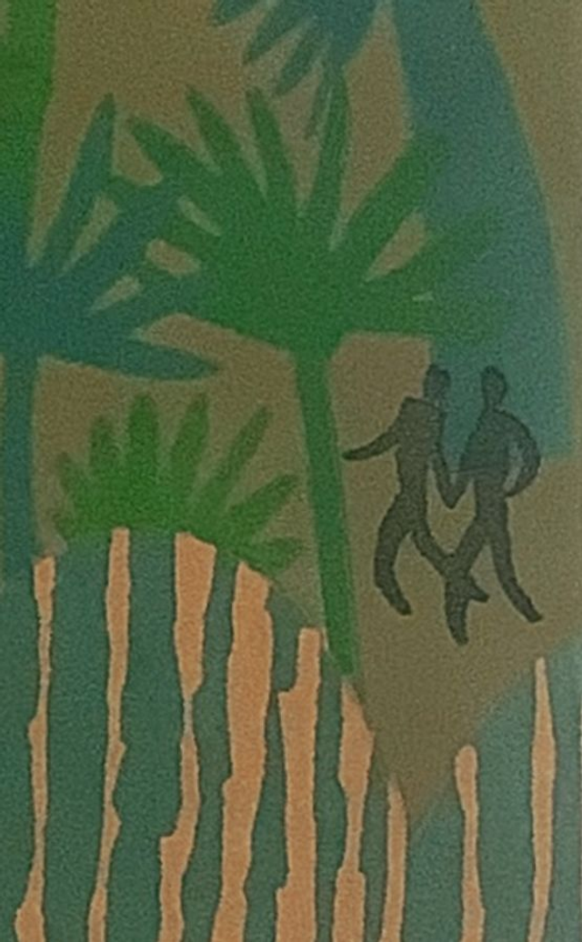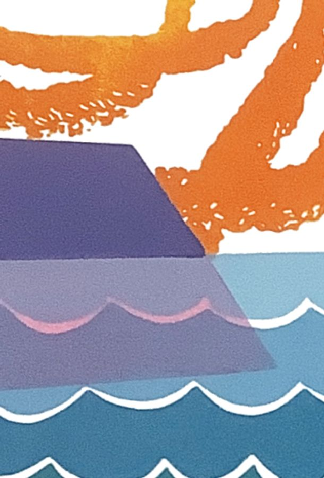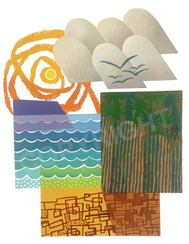 "Angry Sun - the garden" a four block reduction linocut. I did want to call it Angry God, but that was too biblical so I used a secular name. Then again the sun is seen by many throughout history as a defacto god. Another of the collage inspired linocuts. Many elements reused and changed from earlier work.