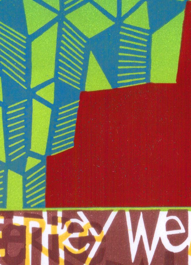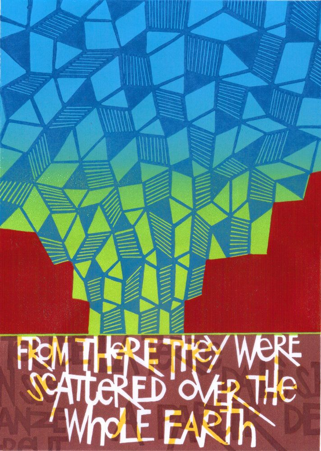 This uses the tower of Babel as a means to explore genealogy and boxes. At the time of this prints creations I was making many drawings with skewed perspective. I used these ideas in more figurative interpretations of Italy and the UK. But here I used them as the metaphor for an inverted Tower of Babel. Each small "house" being the side, top or base of another. The words at the base are repeated in French, German and Italian.