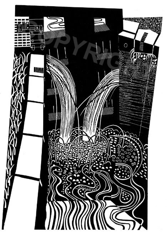 A return to the leaking lock. I've looked at this motif in various guises; drawings, paintings and colour linocuts. I felt the drama of b&w would work best though.