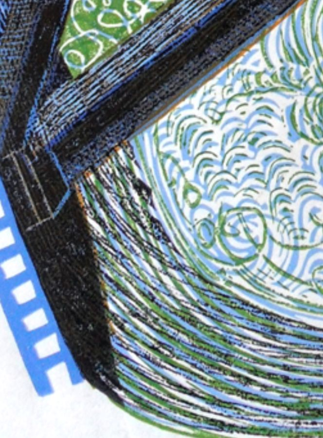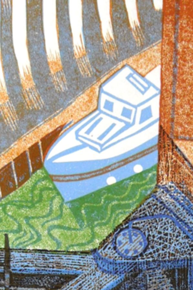 Looking down into the cavernous locks at Cardiff Marina this is a multiblock reduction linocut. Although not exactly a canal, it is a lock, which I think I can get away with. What interested me most was the perspective and the water filling up the lock. The boat wasn't that small, the lock is BIG.