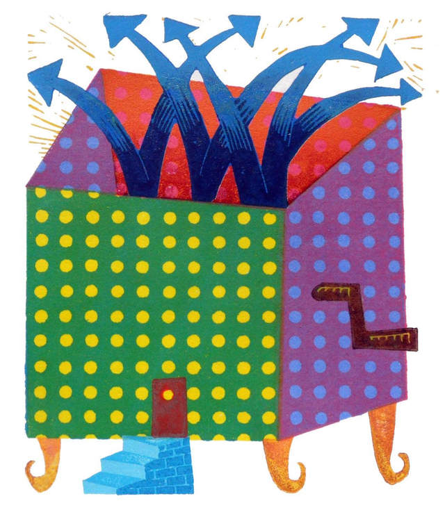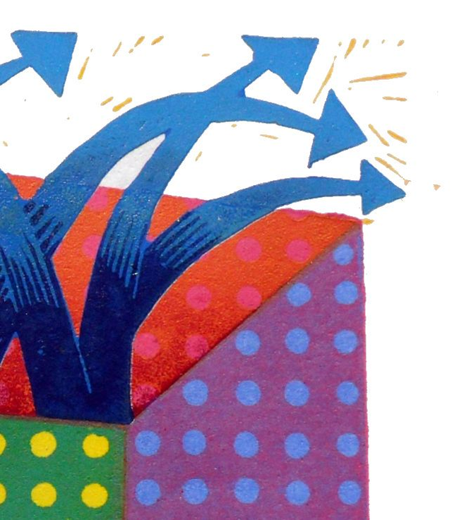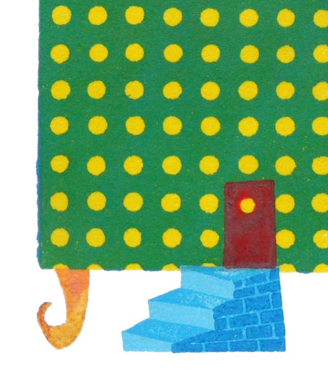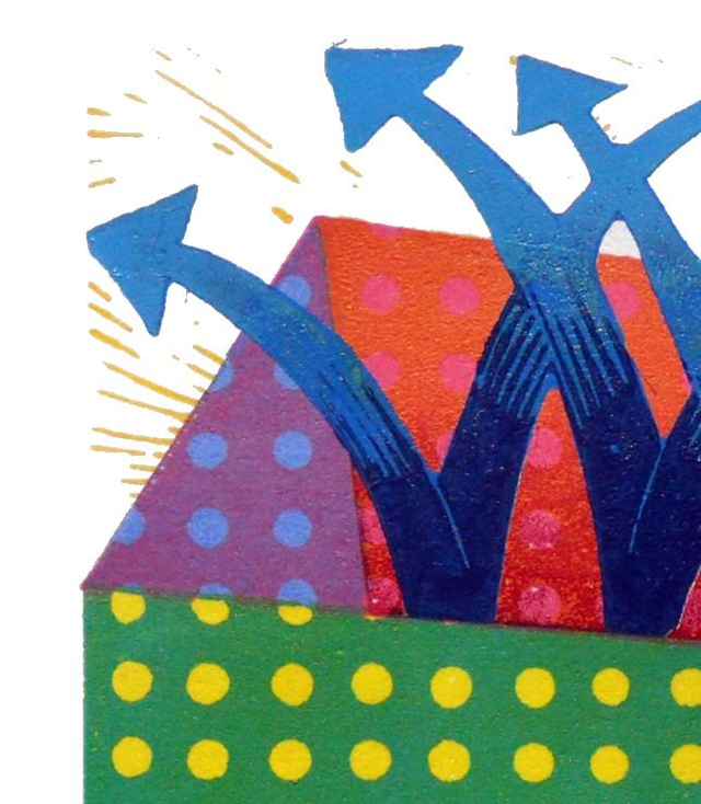 This linocut is part of my ongoing work based on my genealogical research. A skewed house, that is typical of my work at the time, or a jack-in-the-box machine that creates the next generation of children.