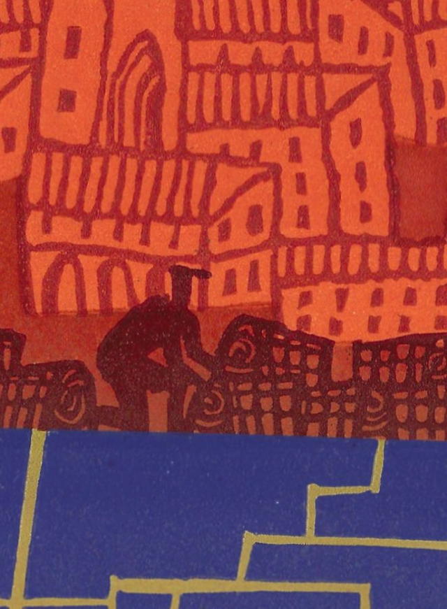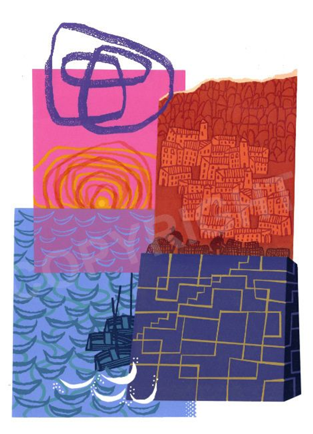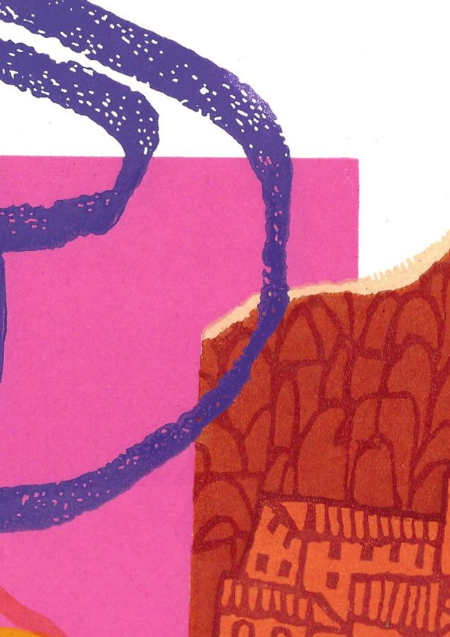 A further look at a sunset incorporating collage elements from other drawings and linocuts. A three block reduction linocut.