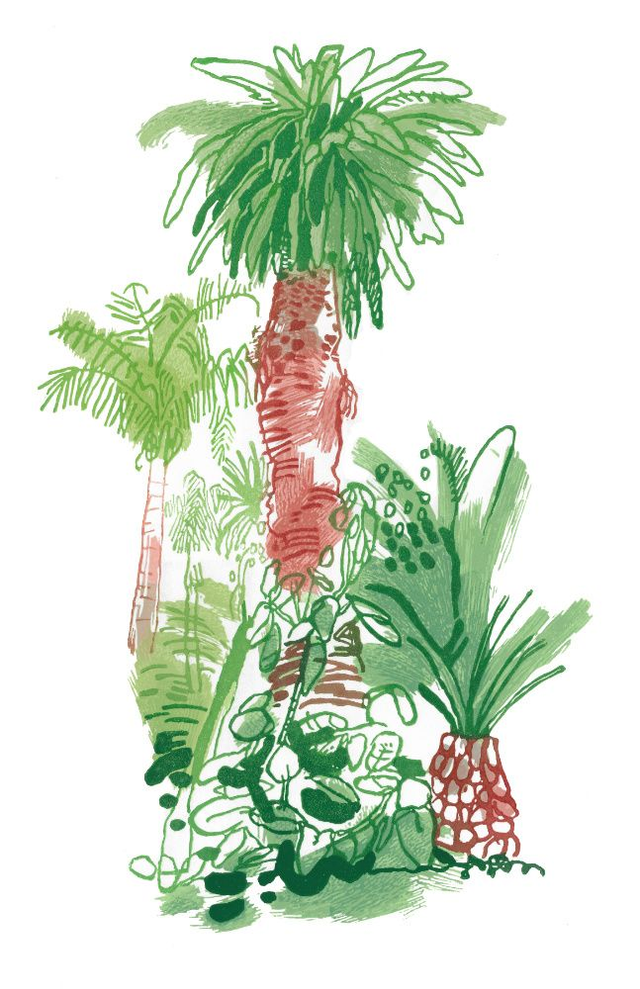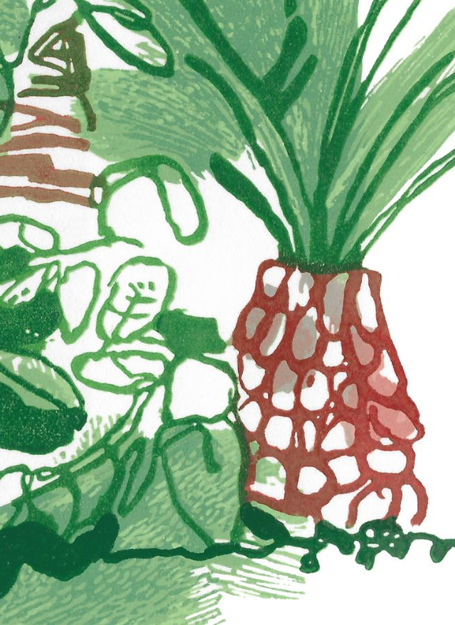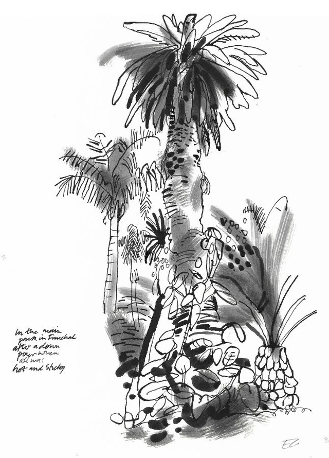 A painterly reduction linocut of the gardens in Funchal, Madeira. This linocut was made from an ink drawing some years before mad win Funchal..