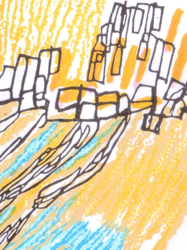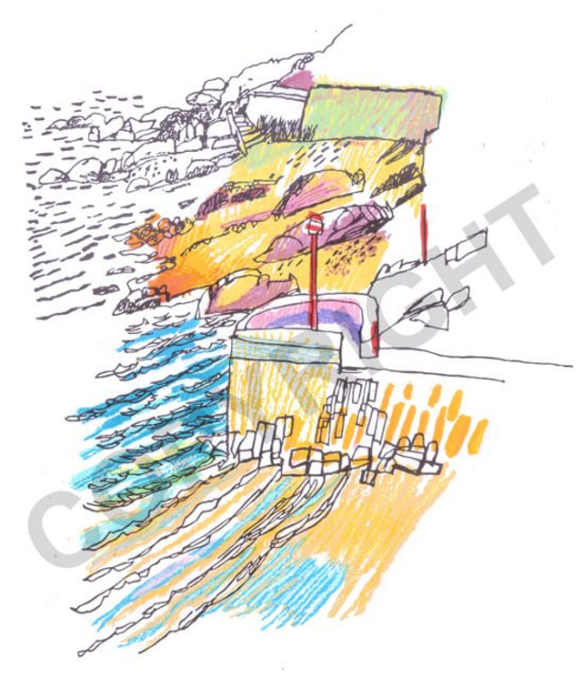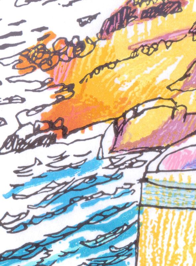 Looking down onto the beach at Looe in Cornwall. This three block reduction linocut was taken from a drawing made in Looe. The drawing was ink and coloured pencil and my intention was to try and replicate that sort of mark-making.