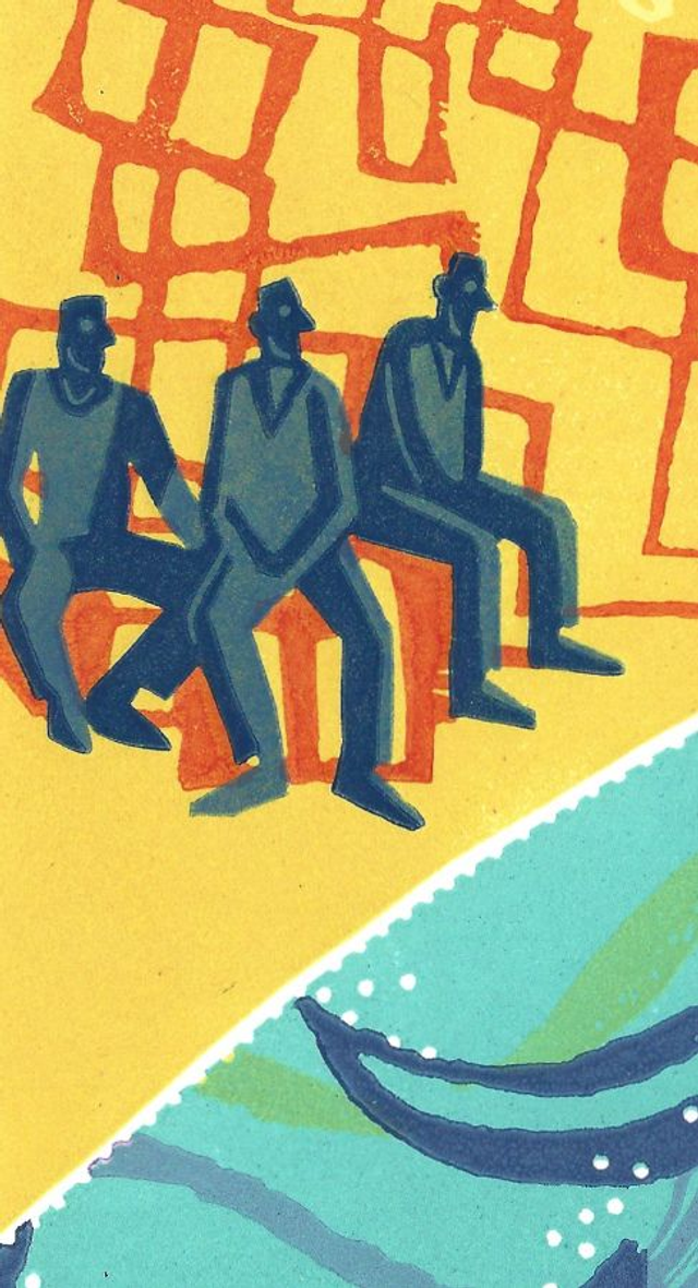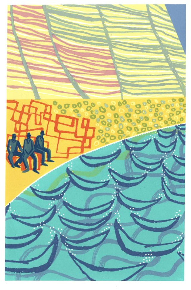 I have been to Penarth lots and lots and try to draw whenever I am there. This linocut is a second look at one of my Penarth drawings, Less about the horizon and cliffs and more about looking at texture and pattern and trying to introduce figures.