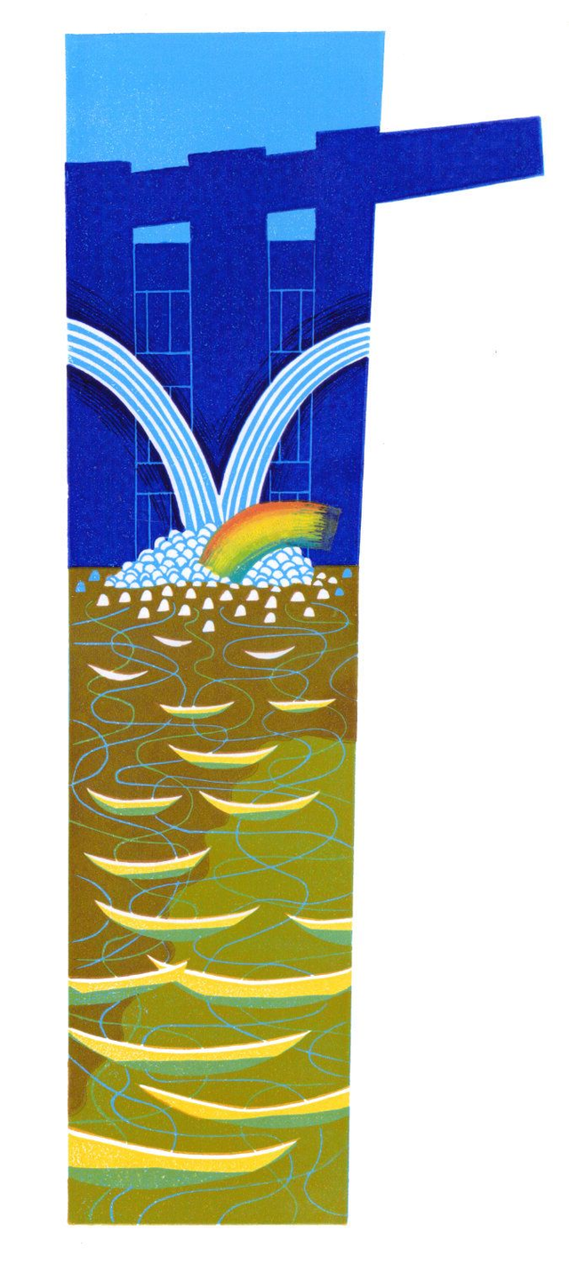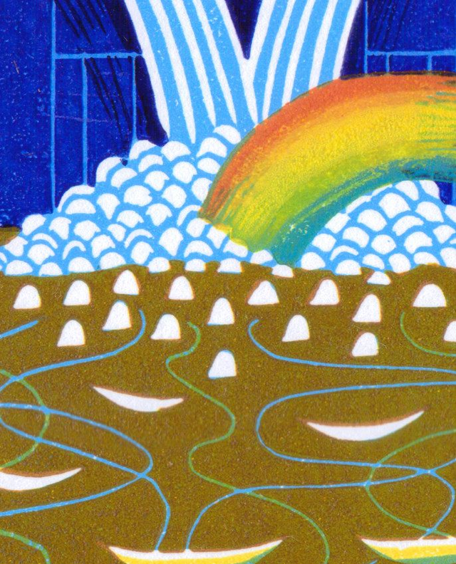 A very tall print of an imaginary lock gate with a rainbow.