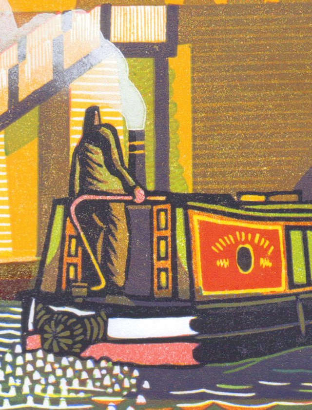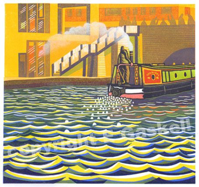 A view of the Regents canal close to Camden Town. Click here YouTube for the video showing how it was made. Printed using the reduction method where, in this case, four blocks have progressively been cut and printed to create the final image. Because of the nature of this type of printing no two prints can be said to be exactly the same. As such the print opposite should be viewed as an example only.