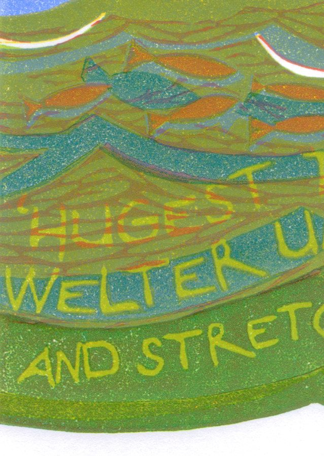Based on a part of an earlier linocut that seemed to look like a snake. It takes a few lines from the poem Sea Serpent by John Brainard, click here to read the full poem.
