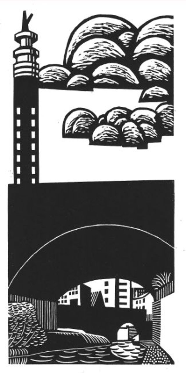 The massive arched bridge of Snowhill over the canal in Birmingham, with the BT tower poking up in the distance.