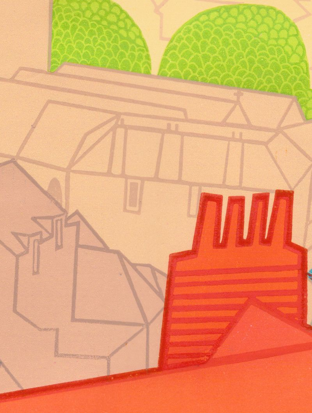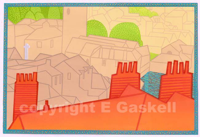 Normally St Ives in Cornwall is shown from the sea or looking onto the harbour. Here I was more intrigued looking down on the town and church. Created as a reduction in effect it is relatively simple, lightest tone first, then progressing forward through to the darkest.