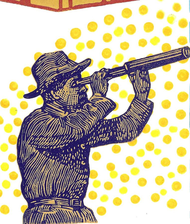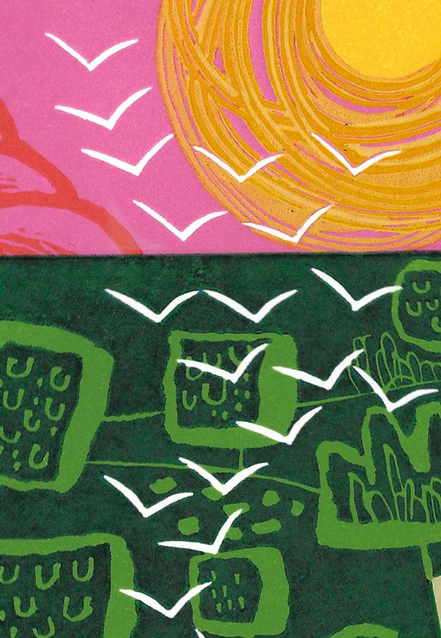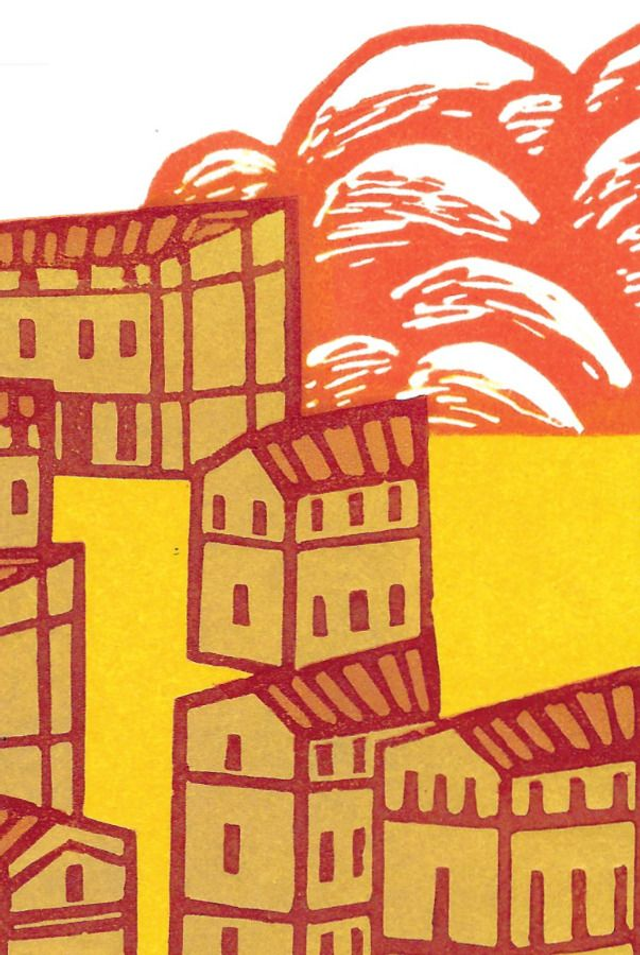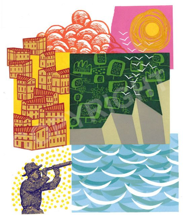 A seascape based on memories of Kingsand in Cornwall, the houses, land and an imagined weather watcher, waiting for change. A two block reduction linocut