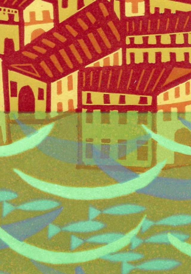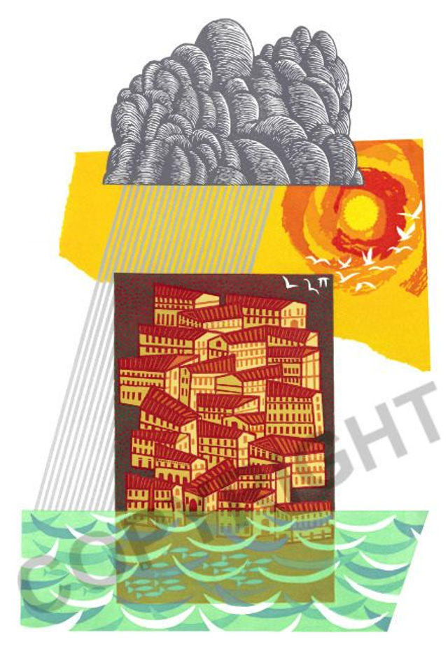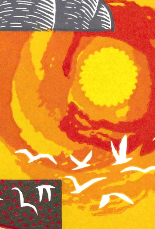 This was created for a specific Printmakers Council exhibition on the theme of the climate. What will become of man as the climate alters, where will he go? This three block reduction shows the land as an ark sinking into the rising seas as the birds leave for sanctuary.