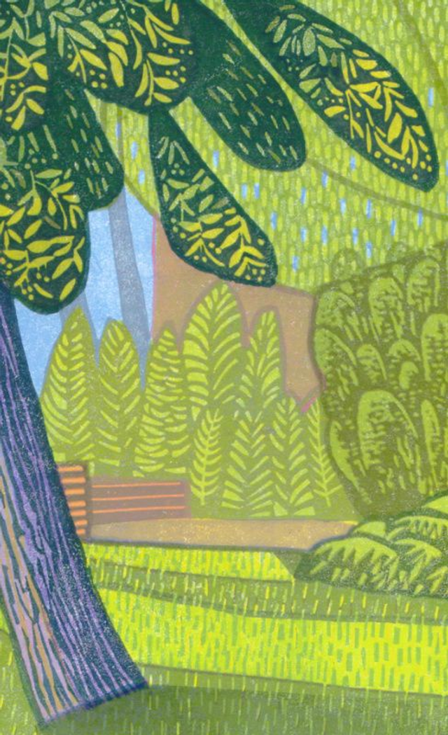 A colourful view of Caldecott Park in Rugby, as people meander, pushing prams, taking photos. It is often full of colour but I can assure you it isn't usually this colourful. This was the first of three linocuts of Caldecott Park.