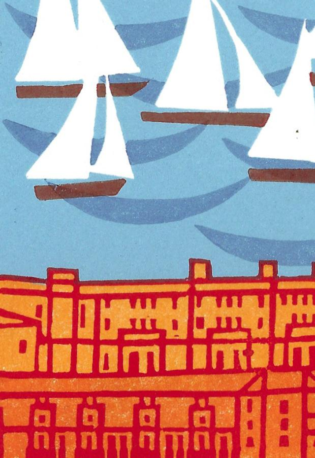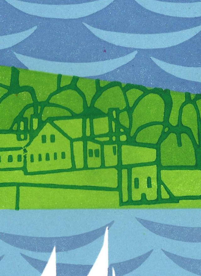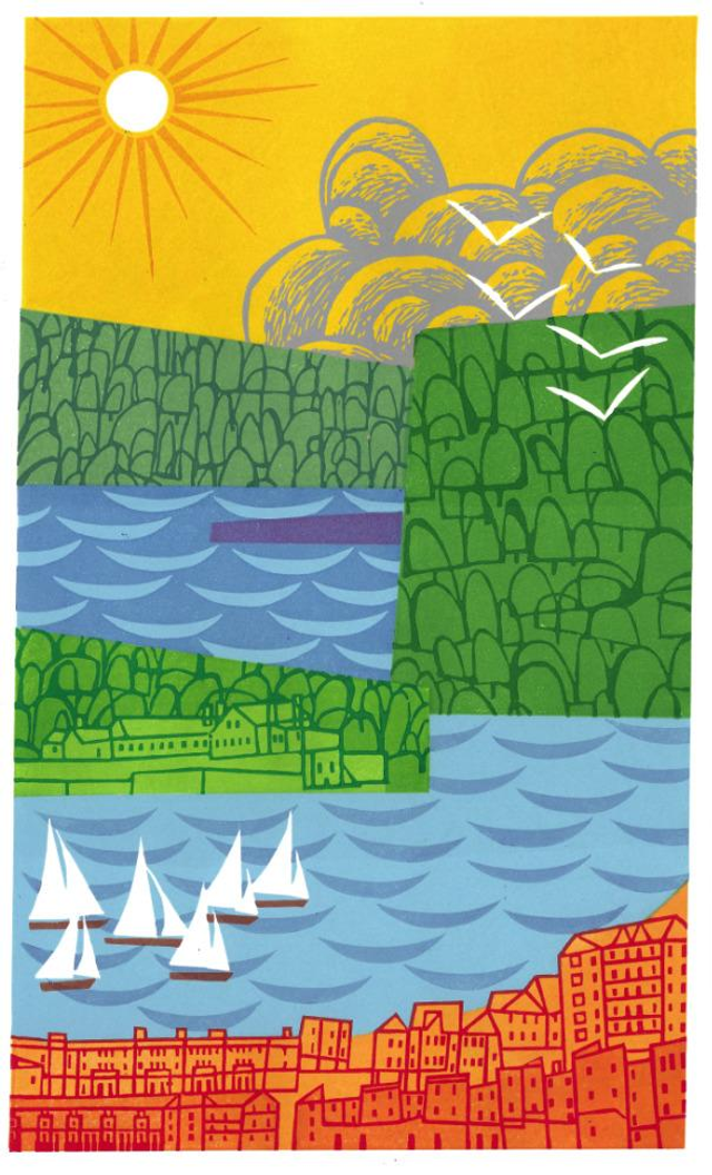Based on memories and drawings made in Cornwall and Devon, this is the second "go" at The Sound in Plymouth. The first print was dark and foreboding, this is brighter, happier. :looking across the sound to Drake Island and Edgcumbe from . There is a step-by-step youtube video of this prints development.