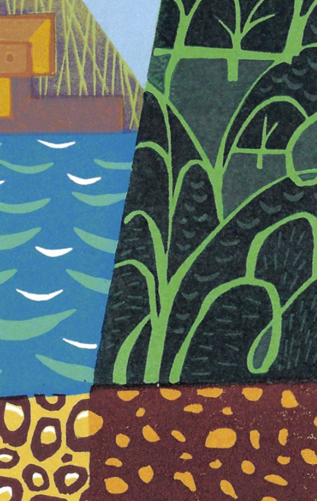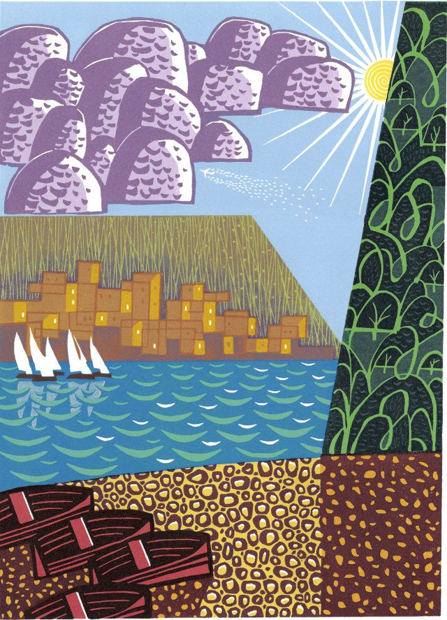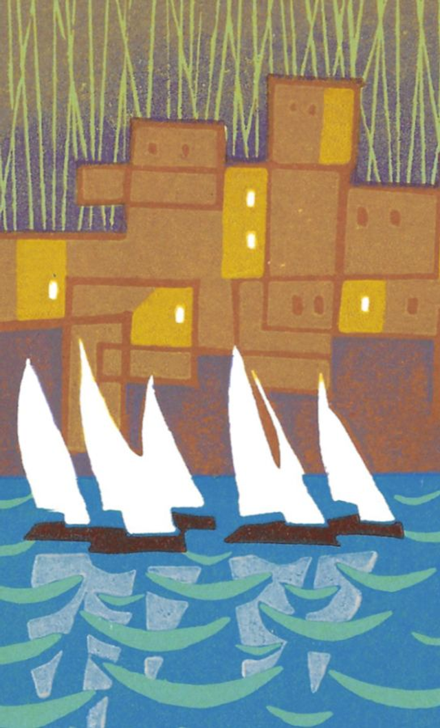 This used the earlier linocut "Night Flight" as the key block. I added two more blocks to that and it became a day scene. An imagined Cornwall.