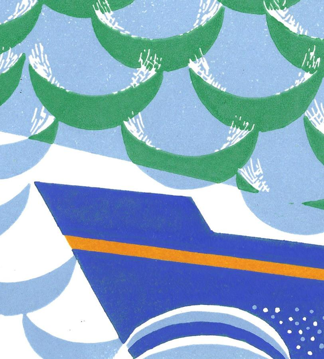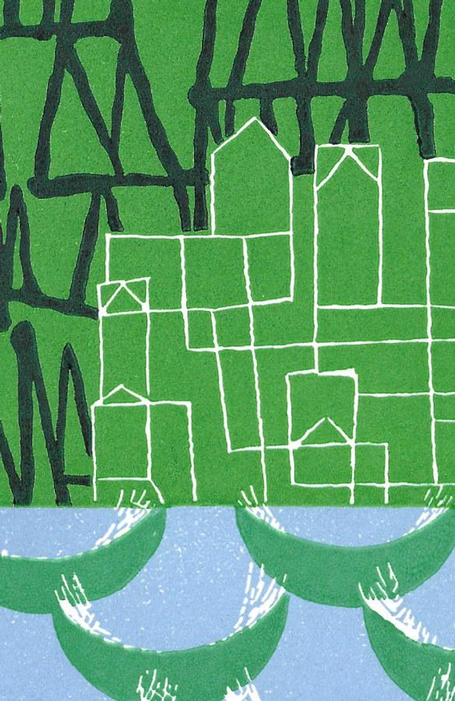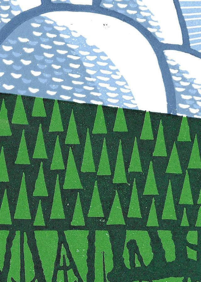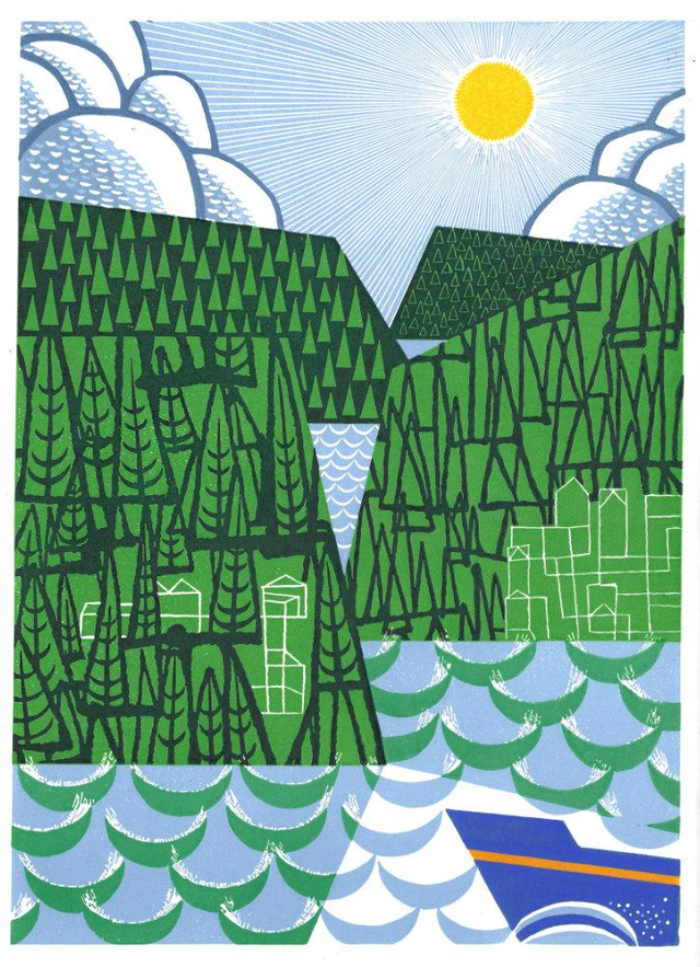 I have visited Canada many times, but only been to Vancouver Island once. It was quite a while ago now, but the one thing I do remember is the ferry to Victoria and the multitude of wooded islands we passed by. This linocut is based on memories of that trip to Vancouver Island in Canada.