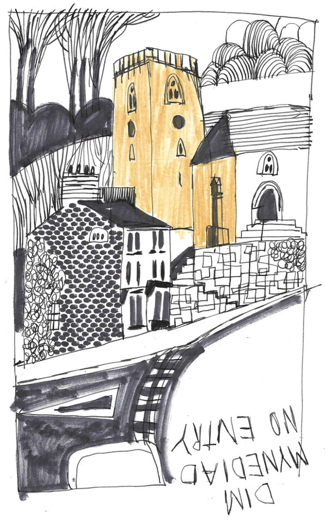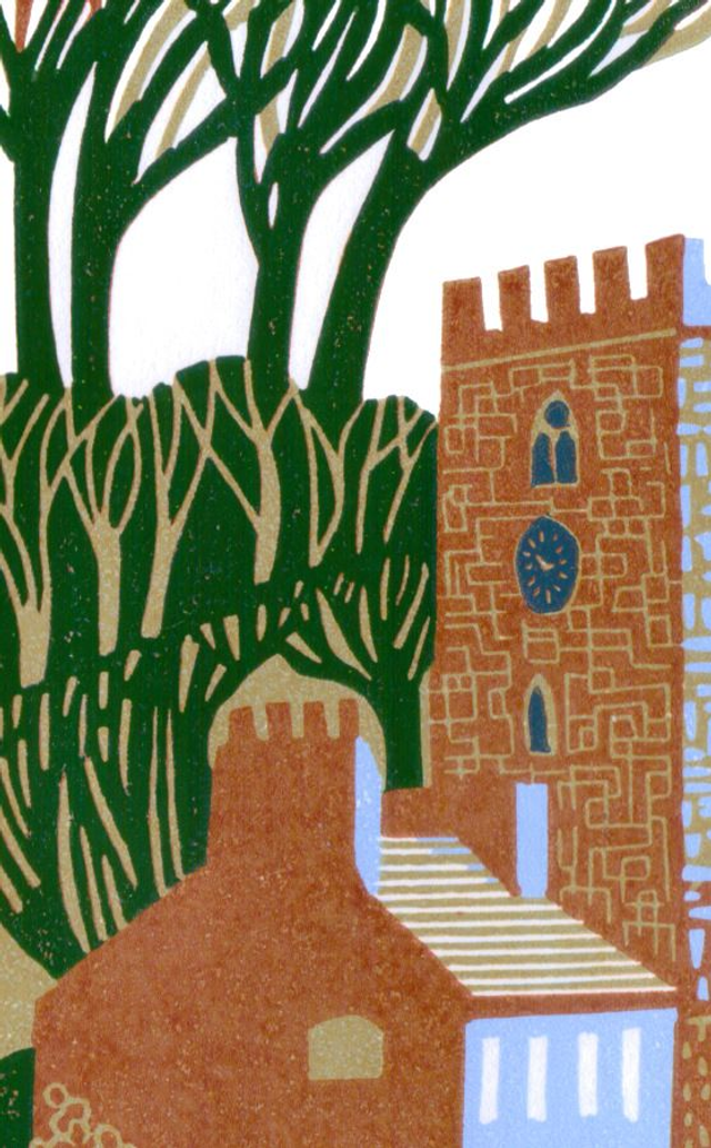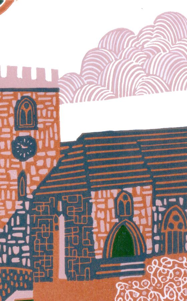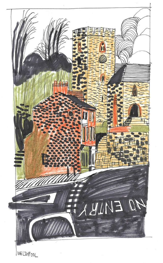 This print shows the church at Welshpool, printed in two colour ways that use the same blocks. I've also included two of the drawings made in Welshpool.