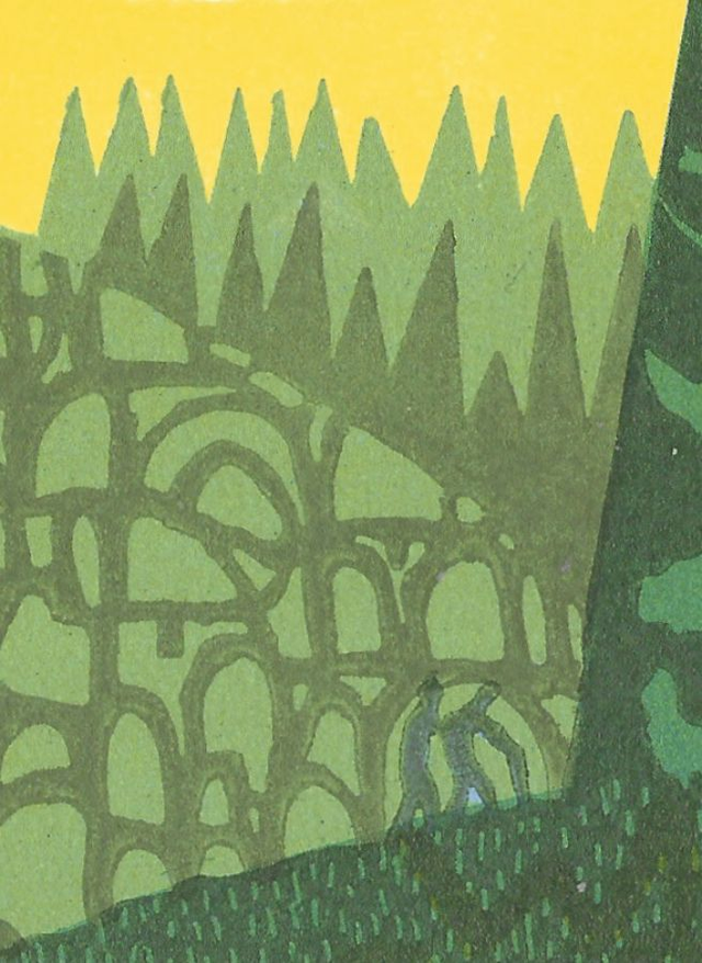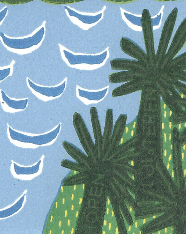 This linocut was made specifically for the German publication "Body & Soul" in 2025. All the edition of 25 were used, leaving me with a set of 6 proofs. In Greek myth, and throughout many of the world myths, trees could speak and were used by the oracles to prophecy. This linocut shows the trees speaking when man would listen, the foreground trees have the word "listen" in various languages in their canopy.